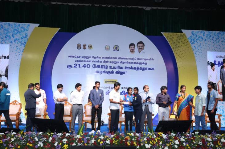 இதன்தொடர்ச்சியாக சர்வதேச, ஆசிய மற்றும் தேசிய அளவிலான விளையாட்டு போட்டிகளில் பதக்கங்கள் வென்ற 819 வீரர், வீராங்கனைகளுக்கு 21.40 கோடி ரூபாய்க்கான உயரிய ஊக்கத்தொகை காசோலைகளையும், கருணை அடிப்படையில் 4 நபர்களுக்கு பணி நியமன ஆணைகளையும் தமிழக துணை முதல்-அமைச்சர் உதயநிதி ஸ்டாலின் நேற்று (26.09.2025) சென்னையில் நடைபெற்ற நிகழ்ச்சியில் வழங்கினார்.